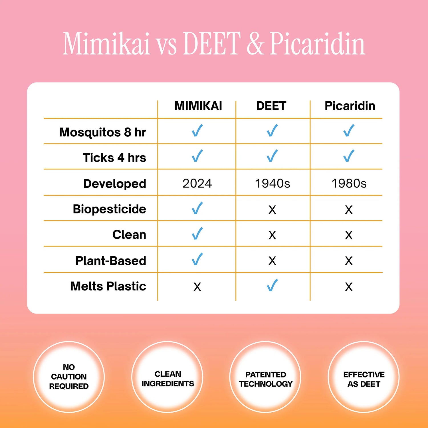 Mimikai is different. It’s the first truly efficacious, skin-friendly bug spray powered by our exclusive plant-derived compound, Undecanone (found in wild tomatoes). Scientifically tested and proven to repel mosquitoes and ticks as effectively as DEET and Picardin without the harsh chemicals or trade-offs. Mimikai is not a pesticide. Our formula is plant-powered, skin-safe, and made with high safety standards-so you get real protection without worrying about what you're putting on your body.